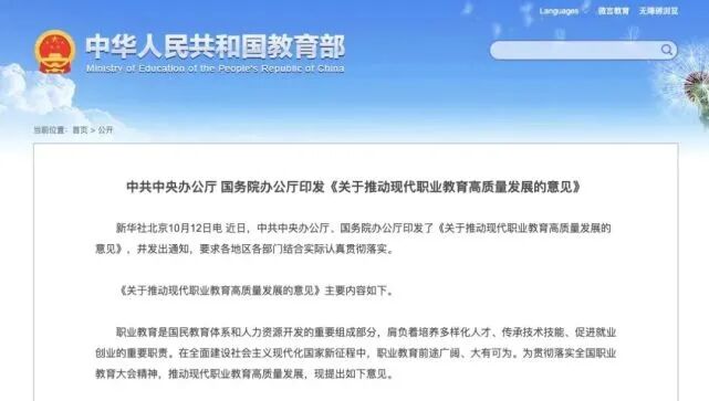 10月12日,中共中央办公厅、国务院办公厅联合印发了《关于推动现代职业教育高质量发展的意见》,《意见》开篇便重点强调:“贯彻落实全国职业教育大会精神,推动现代职业教育高质量发展”。